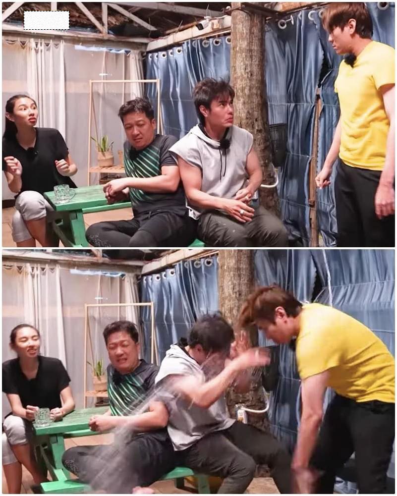 Và kết quả là Kiều Minh Tuấn "nổi nóng" đứng dậy hắt tung chai nước đang cầm trên tay. Bị nước bắn vào mặt, Lê Dương Bảo Lâm ngồi im với biểu cảm sợ hãi. Hành động này của Kiều Minh Tuấn cũng khiến cả Trường Giang lẫn Thùy Tiên đều 'đứng hình' vì sốc..