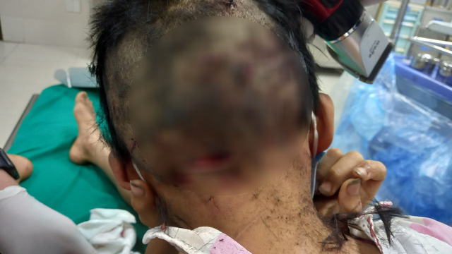 Vết thương lớn nhất vùng đầu dài khoảng 5x0,5cm còn lại các vết thương kích thước 3x0,2cm, vết thương đùi trái khoảng 7x5cm lộ nhóm cơ đùi trước trong. Bé trai đau đớn, hoảng loạn.