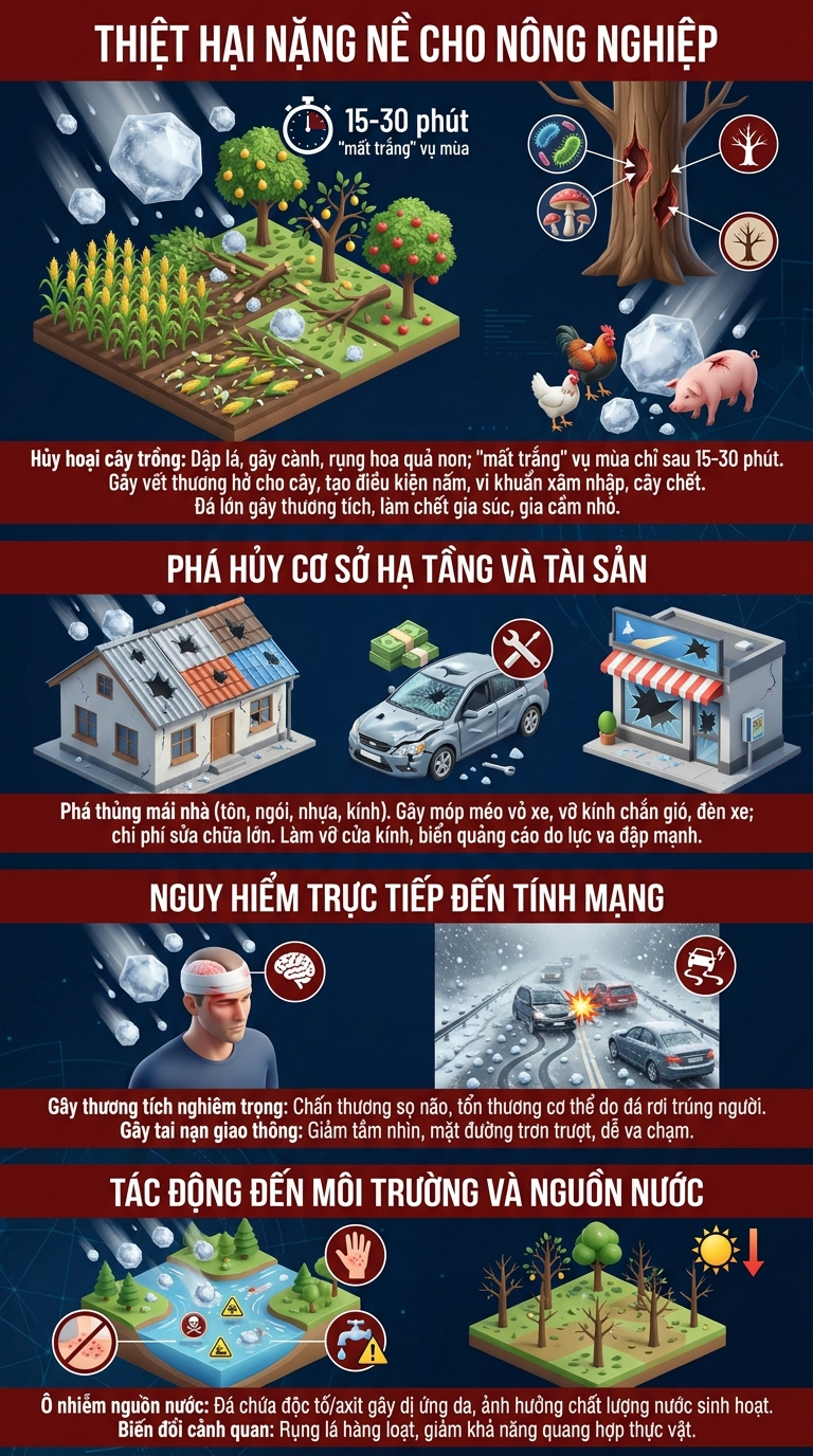 Mưa đá có sức tàn phá khủng khiếp trong thời gian rất ngắn. Tùy thuộc vào kích thước viên đá (từ hạt đậu đến bằng quả trứng gà, thậm chí lớn hơn) mà tác động của nó có thể từ gây hại nhẹ đến thảm họa đến con người, vật nuôi, môi trường.