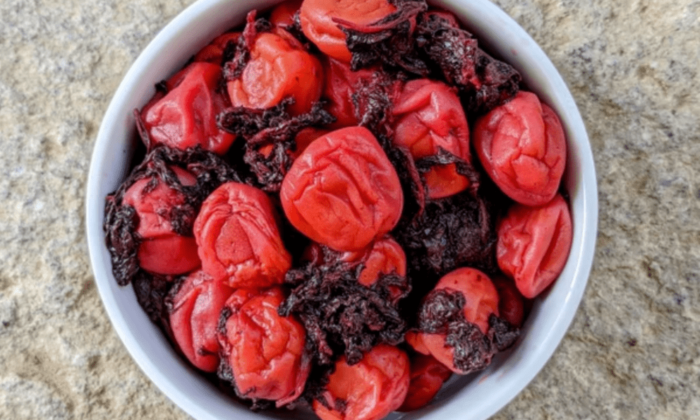 Trong đó, tía tô đỏ gắn liền với món mơ muối (Umeboshi). Đây là món ăn truyền thống rất đỗi quen thuộc, thường được ăn kèm cơm trắng, pha trà hoặc làm nước uống. Để làm ra mẻ mơ ngon đúng điệu, người Nhật luôn thêm lá tía tô đỏ vào để tạo màu sắc và tăng hương vị. Ngoài tạo màu, tía tô còn giúp bảo quản và tăng tính kháng khuẩn cho món ăn.