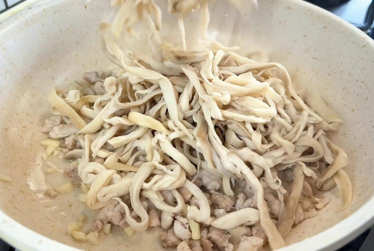 Bước 4: Cho dầu vào chảo, cho thịt băm vào xào thơm, thêm tỏi băm và cho nấm xé sợi vào xào đến khi chuyển màu cánh gián.