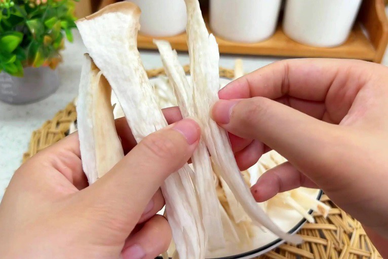 Bước 2: Cho nước vào nồi đun sôi, thả các dải nấm đã xé sợi vào chần qua 1 phút rồi vớt ra, vắt sạch nước.