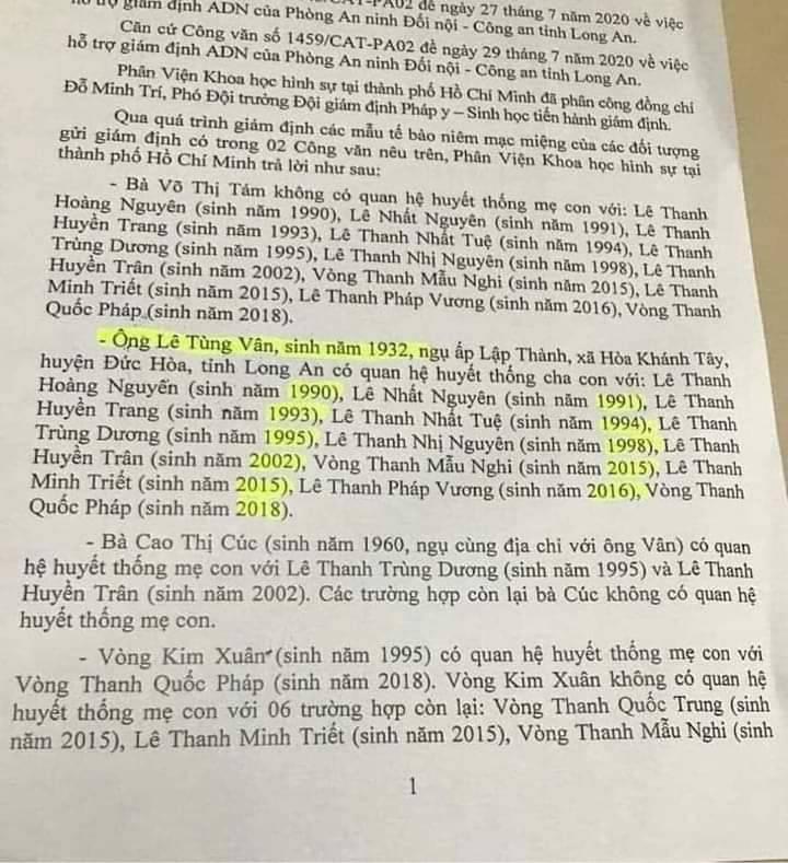 Trong đó, Vòng Thanh Kim Xuân (sinh năm 1995) có quan hệ huyết thống mẹ con với Vòng Thanh Quốc Pháp (sinh năm 2018). Nếu tờ giám định này là chính xác thì đứa con nhỏ nhất của ông Lê Tùng Vân, bé Quốc Pháp, ra đời khi ông Vân đã 86 tuổi.