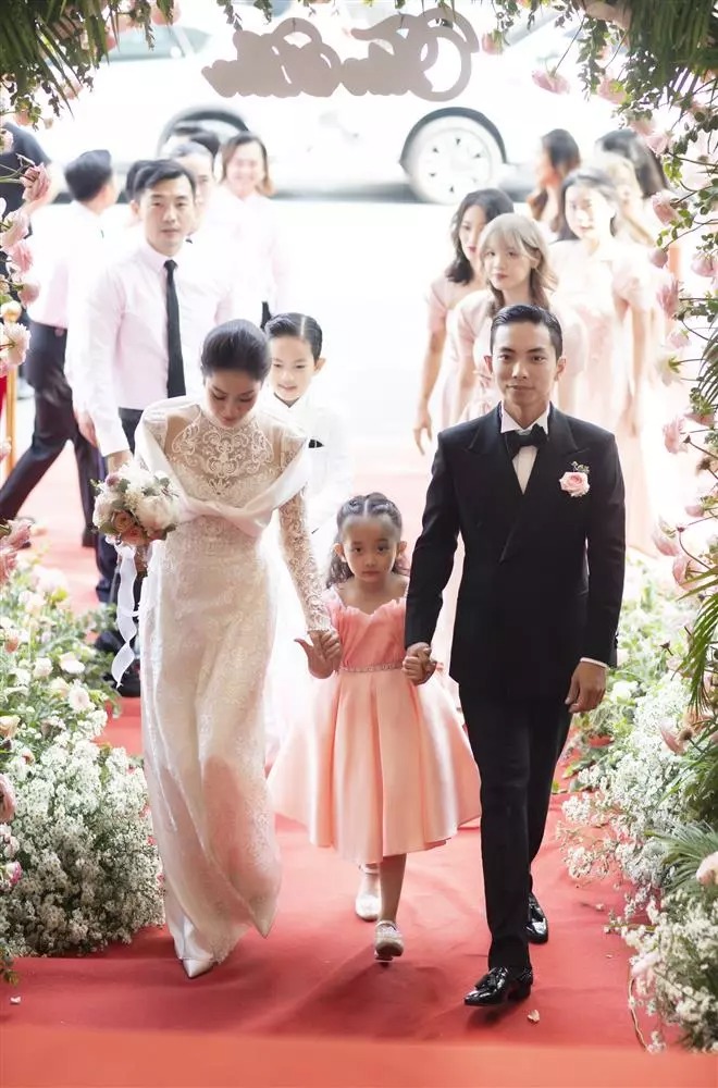 Sáng 12/12, lễ ăn hỏi và rước dâu của Khánh Thi - Phan Hiển được tổ chức trước tiệc cưới khoảng 10 ngày, tại nhà riêng. Cô dâu và chú rể rạng rỡ xuất hiện trong ngày vui cùng hai con. Khánh Thi lựa chọn mẫu áo dài cưới chất liệu ren cách điệu.