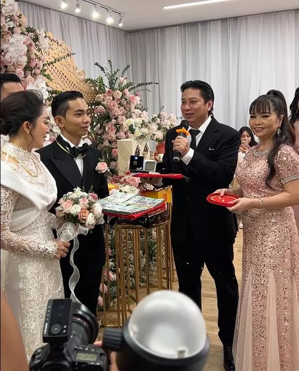 Riêng mẹ của Khánh Thi cũng xúc động bật khóc vì bà đã chờ đến 10 năm đến chứng kiến ngày hạnh phúc viên mãn này của con gái cưng. Bà tặng cho ái nữ cả xấp vàng miếng nhìn thôi cũng thấy vô cùng giá trị. Ngoài ra, bà cũng tặng thêm dây chuyền khá đắt giá cho con rể.