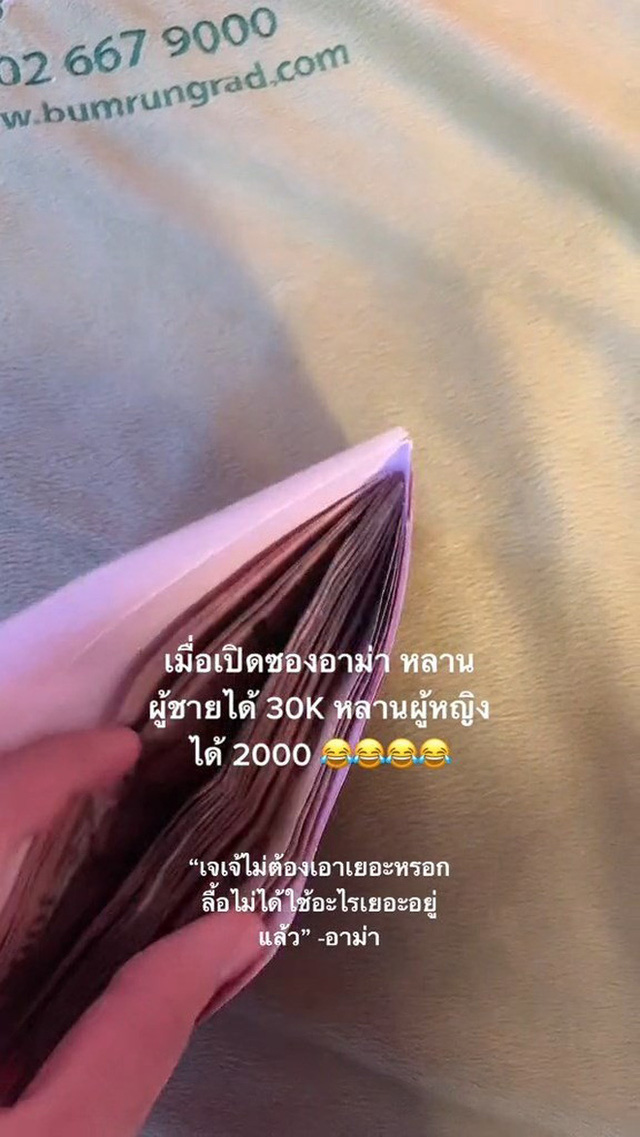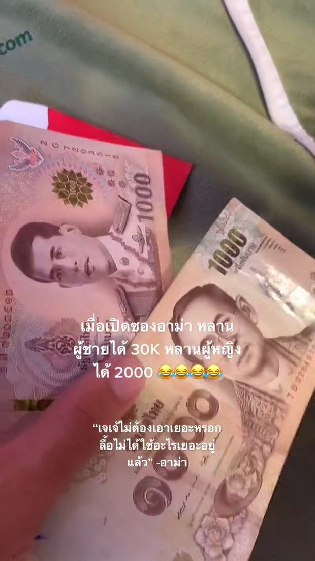 Chuyện sẽ không có gì đáng nói nếu số tiền trong các phong bao mừng tuổi không chênh lệch rõ rệt. Anh chàng thì nhận được cả một xấp 30.000 baht (khoảng 20,6 triệu đồng) và em gái của anh lại chỉ nhận được 2.000 bath (khoảng 1,3 triệu đồng) mà thôi.