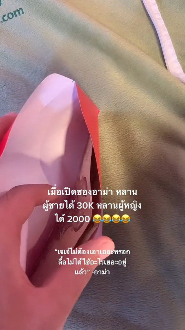 TikToker tự hào khoe: "Khi tôi mở phong bao của bà, cháu trai được 30.000 baht, cháu gái được 2000 baht. Jay Jay (tên người em gái) không phải lấy nhiều".