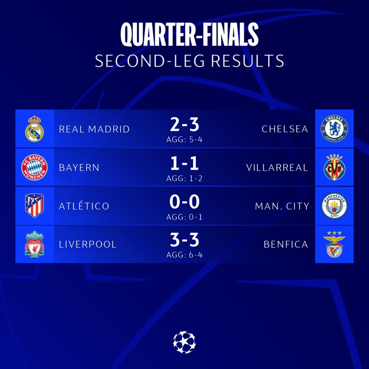 Vòng tứ kết Champions League đã khép lại vào sáng nay, với hai tấm vé cuối cùng được trao cho Man City và Liverpool.