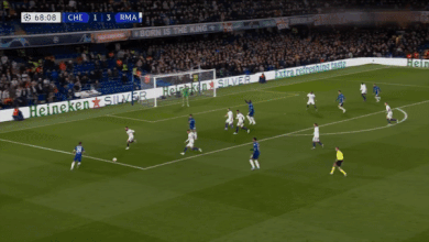 Đội trưởng Cesar Azpilicueta tạt bóng đập chân một cầu thủ Real Madrid đổi hướng đến vị trí của Lukaku không bị ai theo kèm. Đối mặt khung thành rộng mở, tiền đạo của Chelsea đánh đầu chệch cột khó tin.