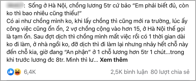 Chuyện như sau: "Sống ở Hà Nội, chồng lương 5 triệu cứ bảo "Em phải biết đủ, còn không thì bao nhiêu cũng thiếu".