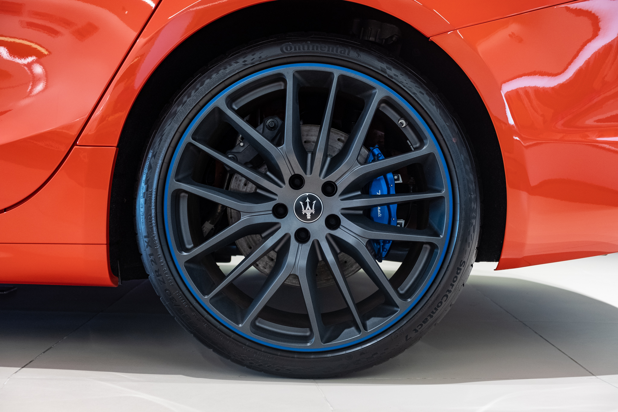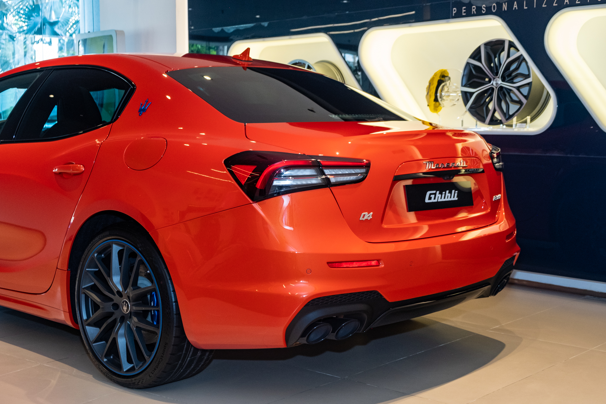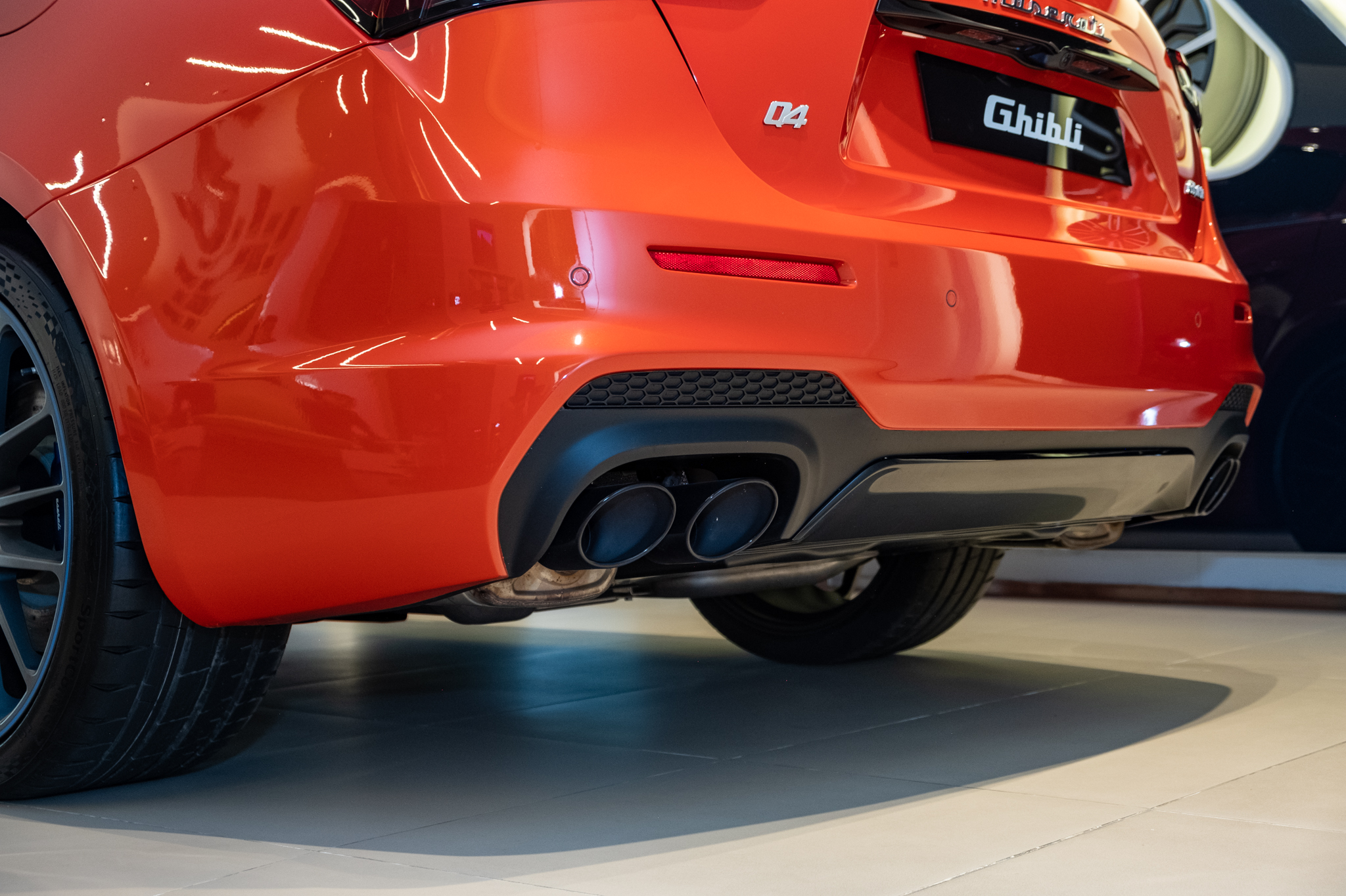 Với màu sơn cam Orange Devil, logo F Tributo, logo cây đinh ba ở bên hông, cùm phanh và viền mâm xe sẽ có màu sơn xanh coban. Trong khi với màu sơn xám Grigio Lamiera, các chi tiết này sẽ có màu cam. Maserati Ghibli F Tributo Special Edition sử dụng bộ mâm Titano kích thước 21 inch.