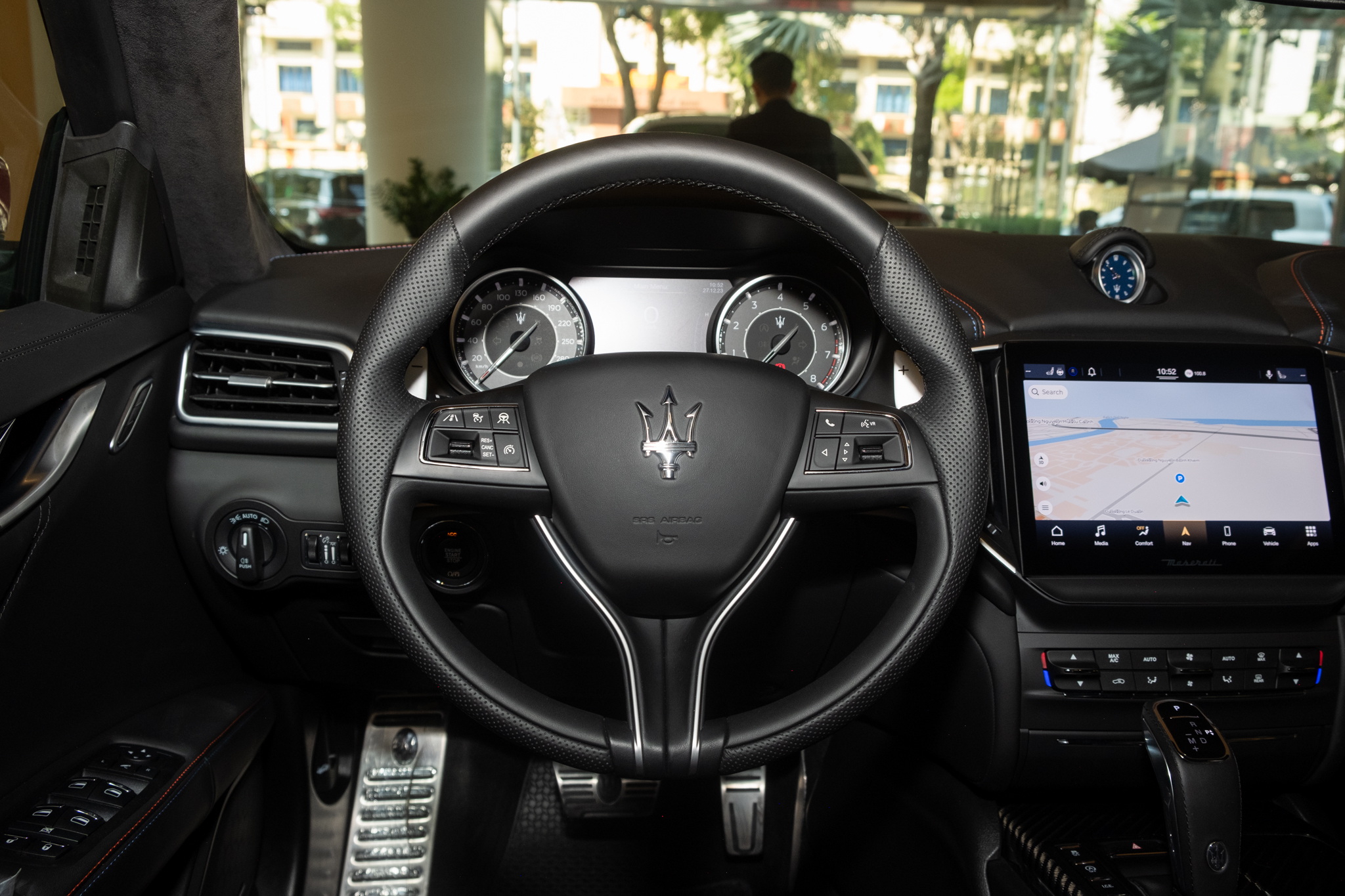 Khoang cabin của Maserati luôn giàu càm hứng cầm lái. Vô lăng ba chấu có lẫy chuyển số nhôm kích thước lớn phía sau gắn ở cột lái. Bàn đạp phanh và ga bọc lớp thép không gỉ. Cần số điện tử.