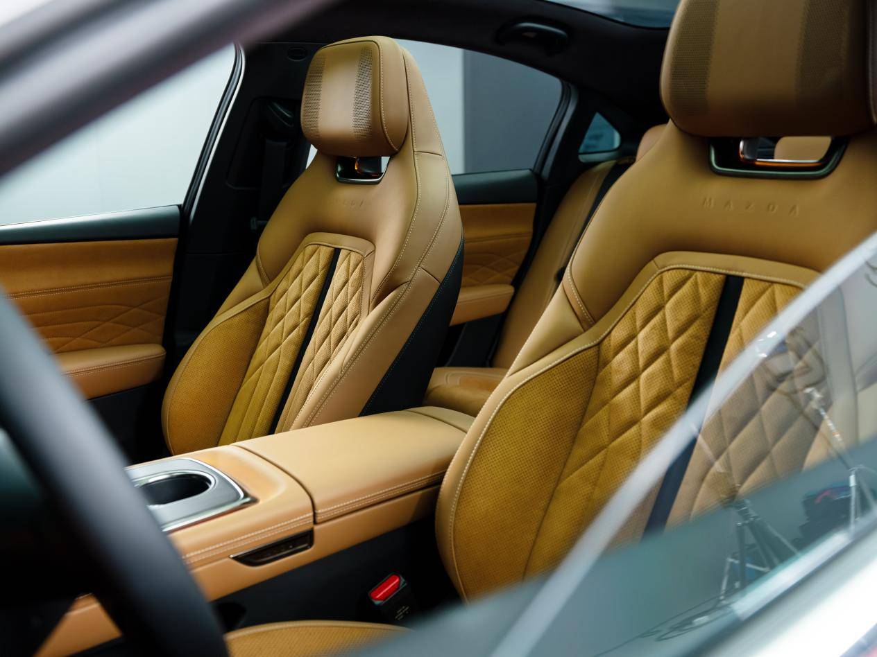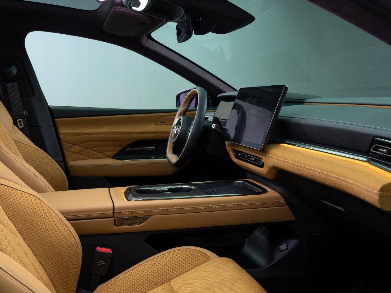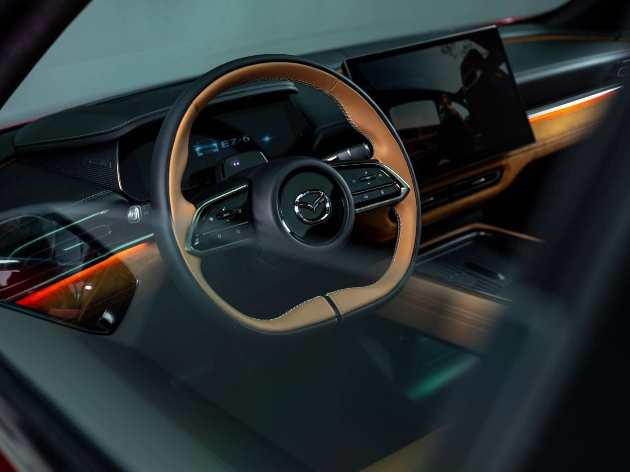 Nội thất xe tối giản khi gần như không thấy nút bấm. Ở giữa là màn hình 14,6 inch điều khiển đa chức năng. Phía sau vô-lăng còn một màn hình lớn khác. Vô-lăng là loại 2 chấu với đáy vát. Hệ thống âm thanh không phải Bose thường thấy mà là loại Sony cao cấp. Đèn trang trí nội thất đặt chìm với tuỳ chọn 64 màu. Khó có thể tìm thấy một chi tiết mang "chất Mazda" quen thuộc nào trên mẫu xe điện mới này.