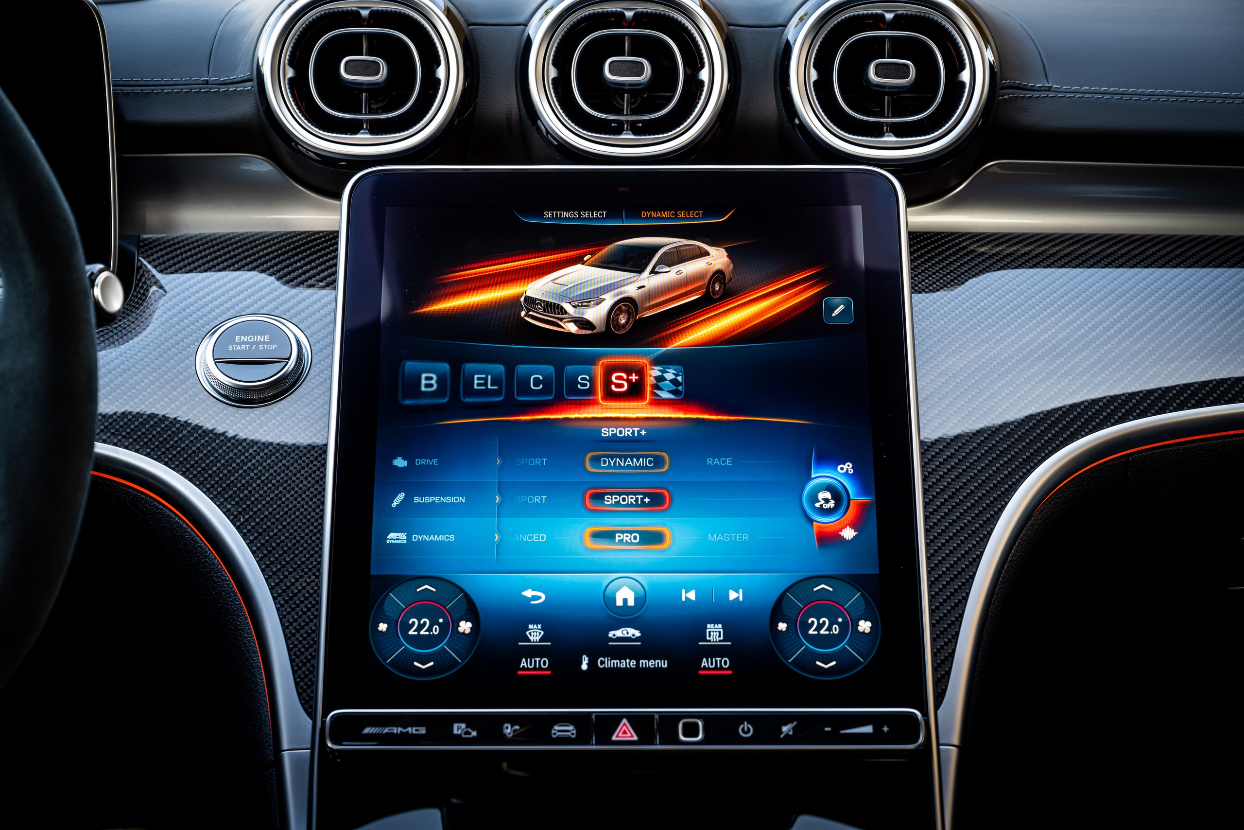 Về tiện nghi giải trí, xe được trang bị hệ thống đa phương tiện MBUX dành riêng cho dòng xe AMG sở hữu E Performance, bao gồm màn hình hiển thị cụm đồng hồ, trên màn hình trung tâm đa phương tiện theo hướng dọc ở bảng điều khiển trung tâm và màn hình hiển thị HUD tùy chọn.