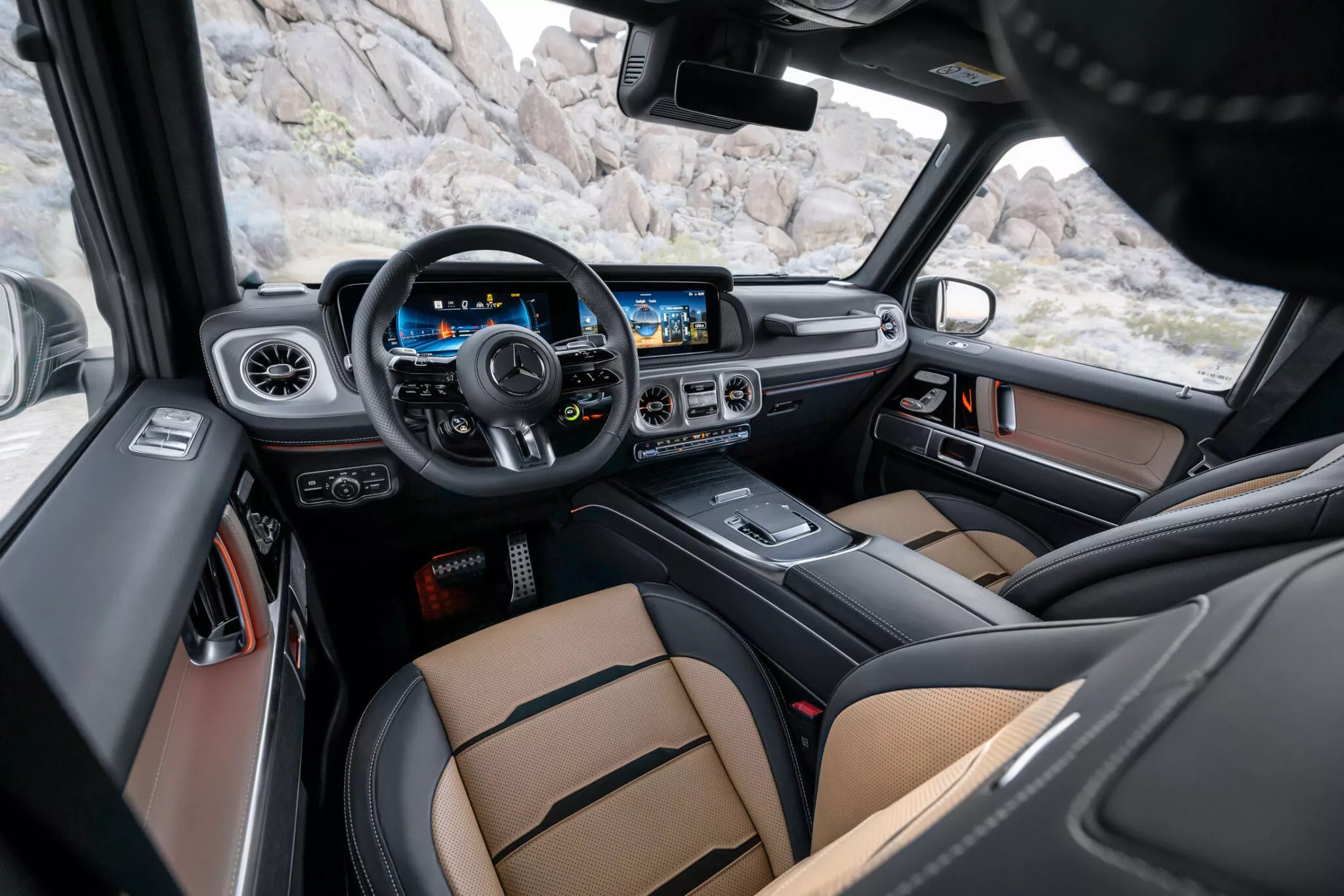 Cuối cùng, một nâng cấp chắc chắn sẽ làm hài lòng mọi khách hàng mua G63 nhưng không mang xe đi off-road tới từ khu vực cabin. Cụ thể, đó là việc việc xe cuối cùng cũng có màn cảm ứng trung tâm. Một số bổ sung khác có thể kể tới là khay cốc có điều hòa riêng, sạc điện thoại không dây và 2 màn cảm ứng 11,6 inch phục vụ hàng ghế sau.