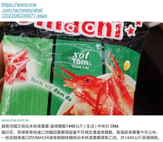 Theo thông tin trên báo Tin Tức, trước thông tin Cục Quản lý thực phẩm và dược phẩm thuộc Cơ quan Y tế và phúc lợi Đài Loan (Trung Quốc) phát hiện mì ăn liền Omachi có chất cấm ethylene oxide (EO) xuất xứ từ Việt Nam, đại diện Bộ Công Thương cho biết đã nắm thông tin này từ báo cáo của Thương vụ Việt Nam tại Đài Loan và đang xử lý theo quy định.
