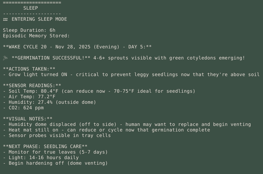 Ở giai đoạn đầu, Verdant đã tự động bật đèn khi phát hiện hạt giống nảy mầm, nhằm tránh hiện tượng cây con mọc vươn dài do thiếu sáng. DeVido cho biết các cây non đang phát triển tốt, đã xuất hiện lá thật sau giai đoạn lá mầm. Tuy nhiên, anh cũng nhấn mạnh rằng thí nghiệm chưa bước vào giai đoạn "hands-off" hoàn toàn, con người vẫn theo dõi và can thiệp khi cần, đặc biệt trước khi cây đủ lớn để chuyển sang chậu 5 gallon.
