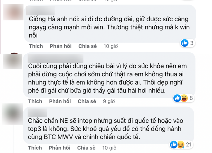 Nhiều netizen đã gửi lời thăm hỏi, mong Nam Em sẽ sớm khoẻ lại để hoàn thành tốt những phần thi sắp tới tại Miss World Vietnam 2022.