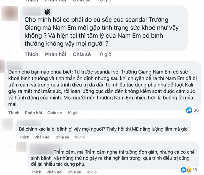 Số khác tỏ ra thông cảm cho Nam Em, thậm chí suy đoán có thể do hậu trầm cảm sau scandal với Trường Giang nên Nam Em đang chịu nhiều di chứng về thể chất.