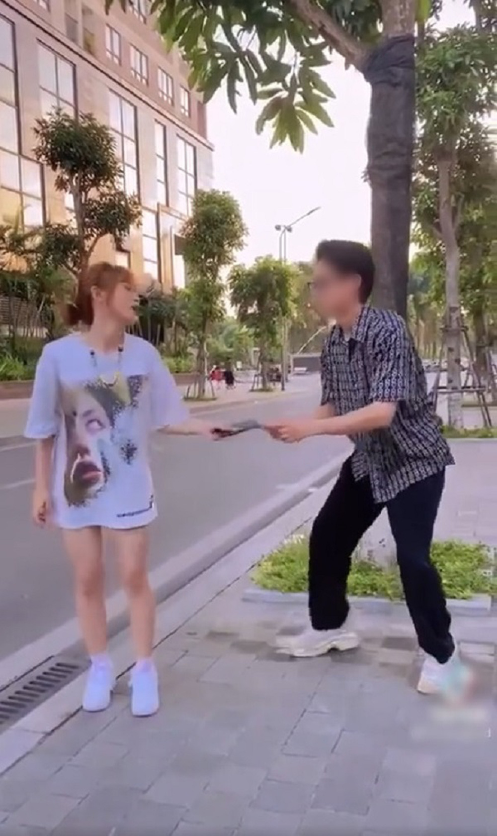 Trong clip, cô gái xinh xắn mặc áo phông dáng dài giấu quần đang đứng ở vỉa hè thì một nam thanh niên nghiêng người đưa điện thoại cố tình chụp lén phần nhạy cảm của bạn nữ. Phát hiện sự việc, cô gái giật chiếc điện thoại khiến bạn nam giật mình.