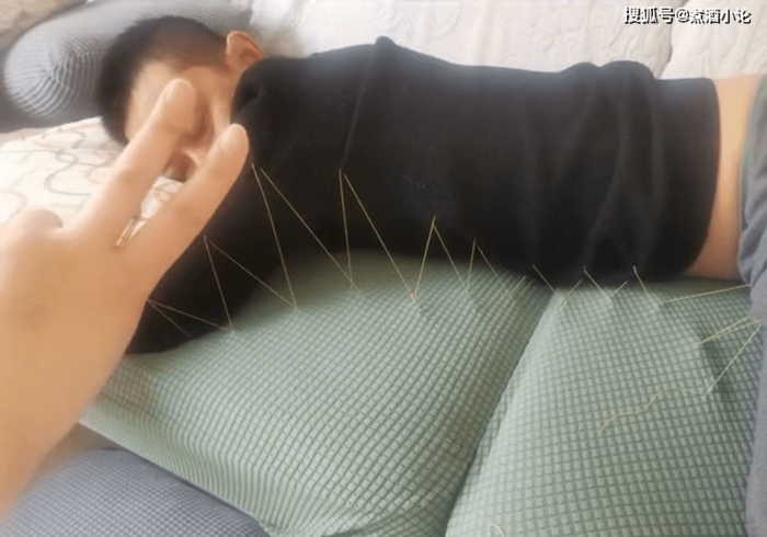 Có thể thấy trong hình ảnh là một ông chồng đang nằm ngủ trên ghế sofa, quần áo trên người đều bị khâu dính vào chiếc ghế với những đường kim, mũi chỉ hình zíc zắc.