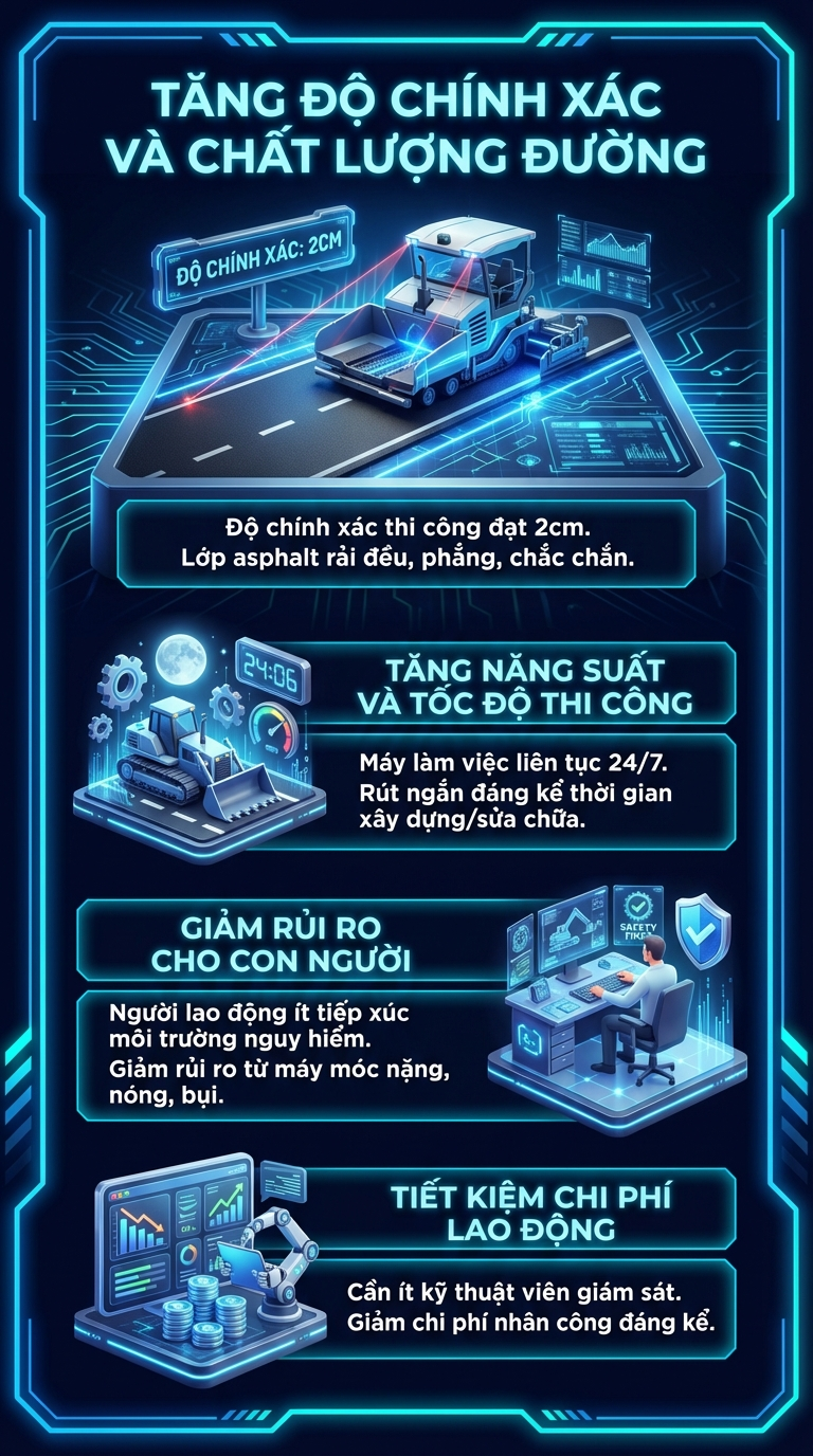 “Độ chính xác 2cm” chính là mức sai số định vị và thi công cực cao của toàn bộ hệ thống tự động. Vì nếu là thi công thủ công, (người lái trực tiếp), sai số thường từ 5–10 cm hoặc hơn, tùy kinh nghiệm người lái, điều kiện thời tiết, mệt mỏi...