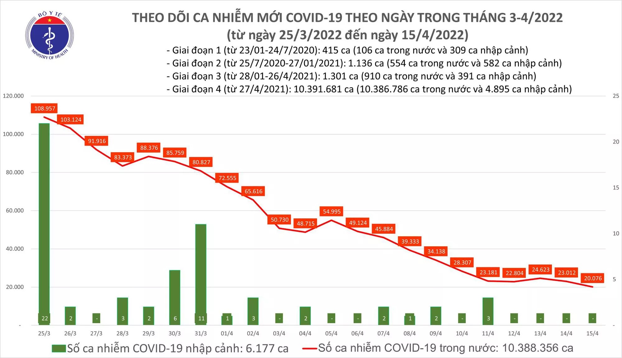 Theo Bộ Y tế, từ 16h ngày 14-4 đến 16h ngày 15-4, trên Hệ thống Quốc gia quản lý ca bệnh COVID-19 ghi nhận 20.076 ca nhiễm mới, trong đó 0 ca nhập cảnh và 20.076 ca ghi nhận trong nước (giảm 2.936 ca so với ngày trước đó) tại 61 tỉnh, thành phố (có 15.555 ca trong cộng đồng).
