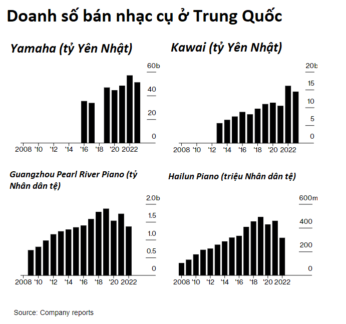 Một nhà sản xuất đàn piano lớn nhất Trung Quốc xin được giấu tên nói với hãng tin Bloomberg rằng doanh số của họ đang giảm với tỷ lệ 2 chữ số. Trong khi đó, Hiệp hội Nhạc cụ Trung Quốc (CMIA) cho biết tổng sản lượng piano nội địa đã giảm 50% so với 4 năm trước đây xuống chỉ còn 190.000 chiếc.