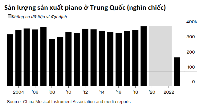 Báo cáo của CMIA cho thấy tổng sản lượng sản xuất piano ở Trung Quốc mỗi năm đều vượt 300.000 chiếc trong khoảng 2003-2019. Thế nhưng sau đại dịch, tình hình thị trường lại trở nên cực kỳ thê thảm.