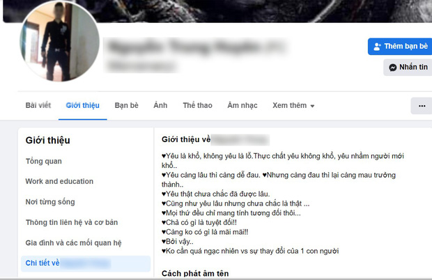 Liên quan đến vụ việc bé gái 3 tuổi nghi bị bạo hành, có 9 vật thể giống đinh trong sọ não, ngay sau khi danh tính nghi phạm được xác định, cộng đồng mạng đã nhanh chóng tìm ra Facebook được cho là của N.T.H. Trong tài khoản này, tại phần giới thiệu, H. chia sẻ triết lý về cuộc sống.
