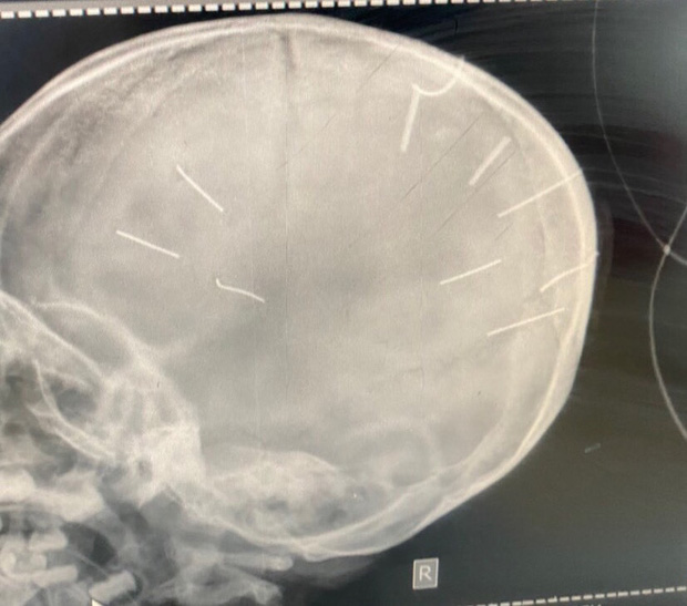 Bệnh nhi sau đó được chuyển lên Bệnh viện Đa khoa Xanh Pôn. Sau khi chụp X-quang nhận thấy trên hộp sọ cháu bé có những vật thể giống đinh, tổng cộng 9 cái. Nhận thấy dấu hiệu bất thường, bệnh viện đã thông tin tới cho Công an huyện Thạch Thất. Trước khi nhập viện, bé A. từng nhiều lần nhập viện trong thời gian ngắn vì ngộ độc thuốc trừ sâu, nuốt dị vật, đau tai...