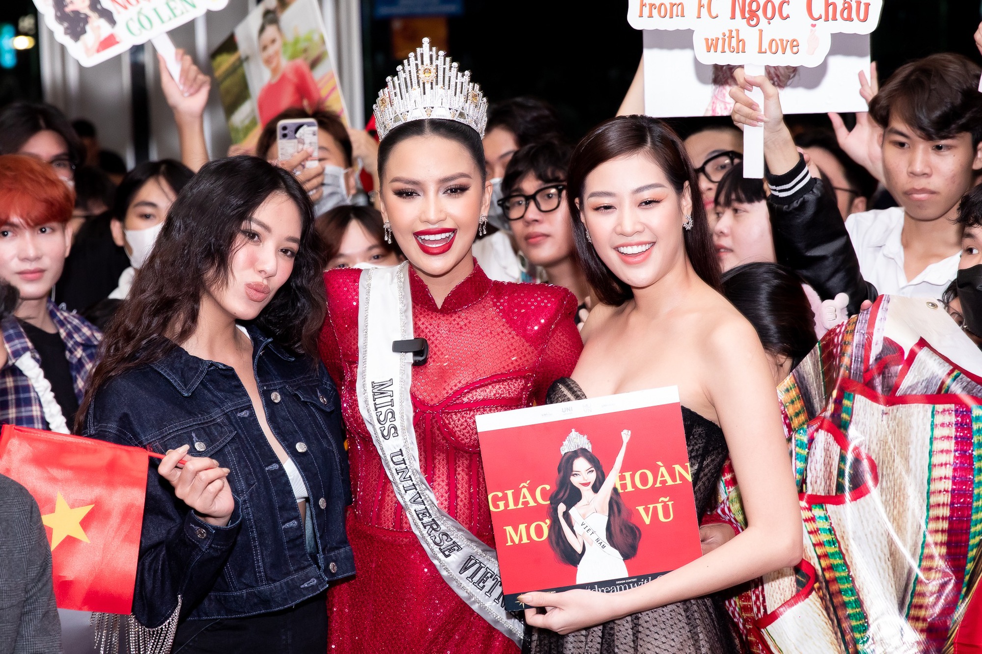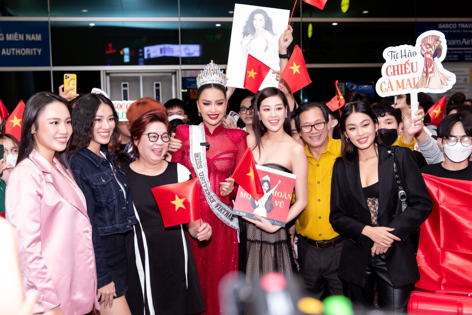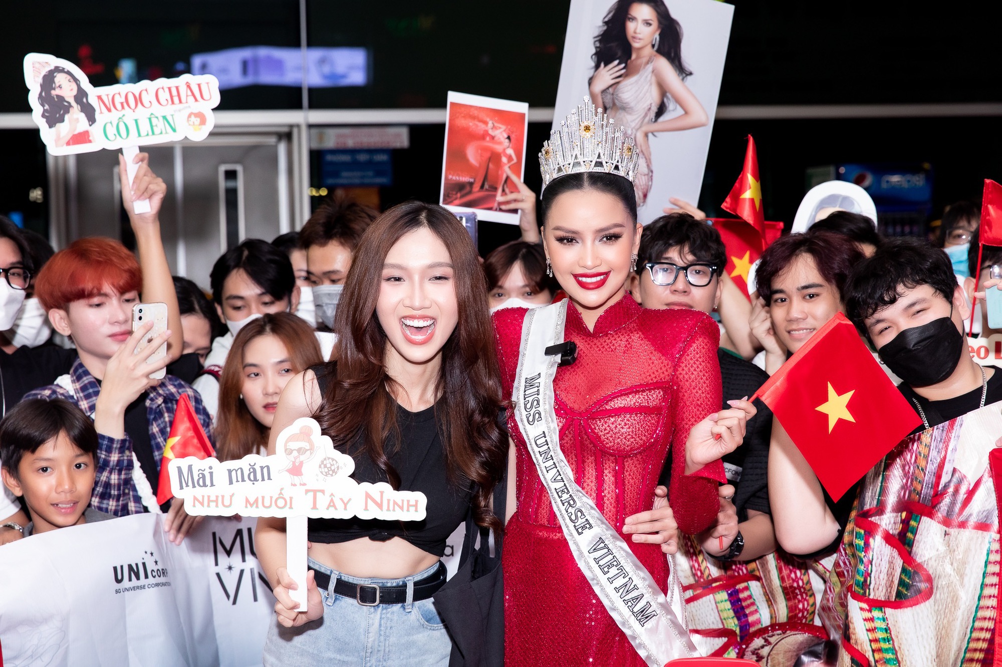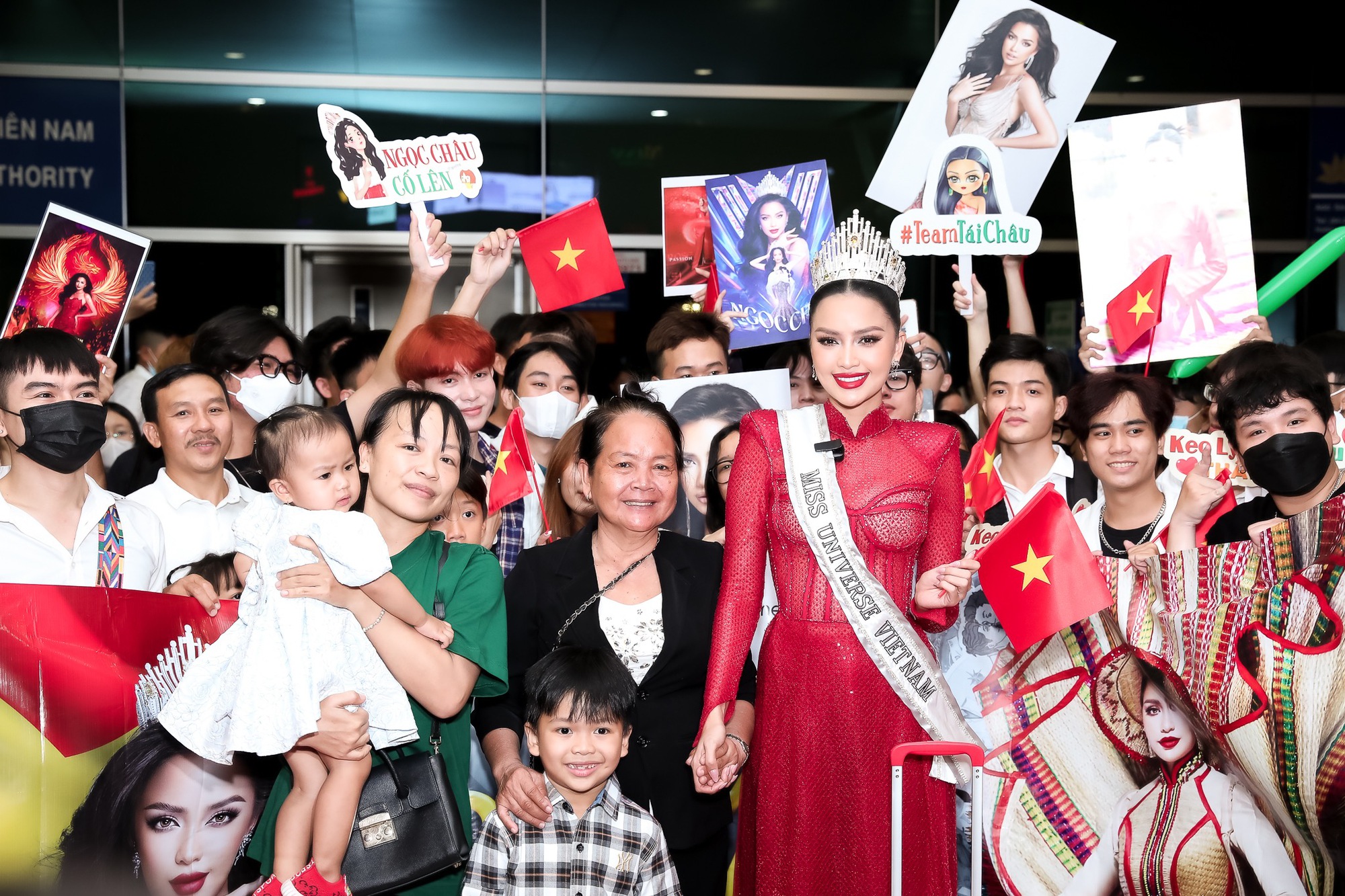 Tối ngày 26/12, Ngọc Châu diện áo dài đỏ rực, xuất hiện tại sân bay Tân Sơn Nhất để khởi hành sang Mỹ, đại diện Việt Nam chinh chiến tại Miss Universe 2022. Gia đình Ngọc Châu và nhiều nàng Hậu thân thiết cùng rất đông người hâm mộ đã đến tiễn người đẹp gốc Tây Ninh lên đường sang Mỹ.