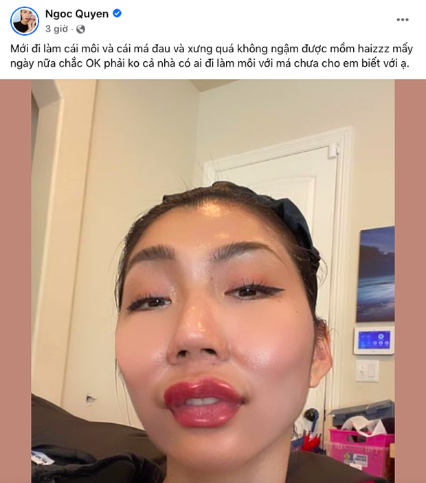 "Mới đi làm cái môi và cái má đau và xưng quá không ngậm được mồm haiz mấy ngày nữa chắc ok phải không cả nhà có ai đi làm môi với má chưa cho em biết với ạ", Ngọc Quyên viết.