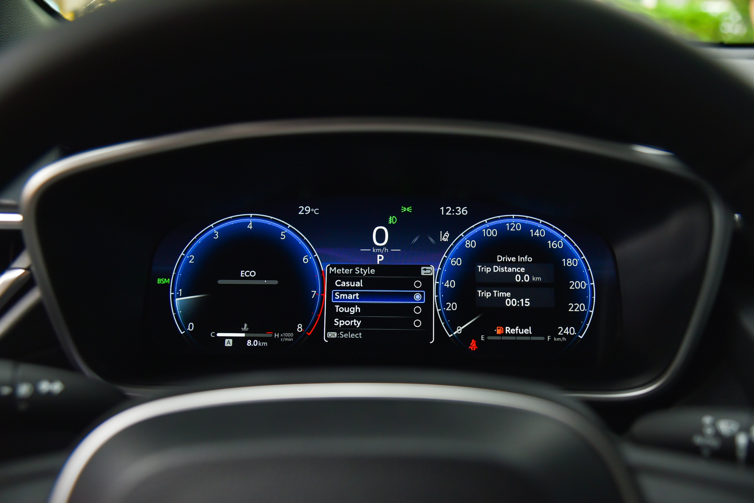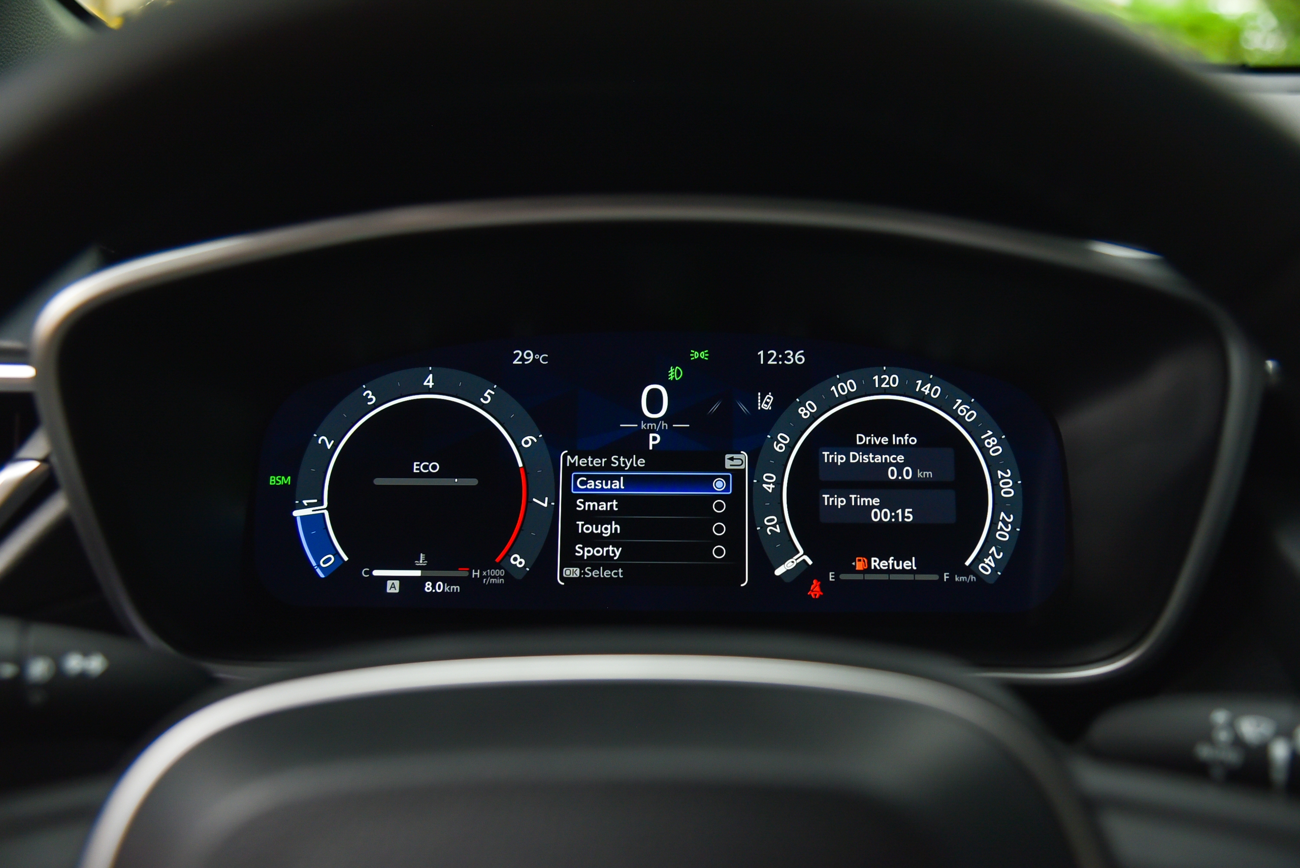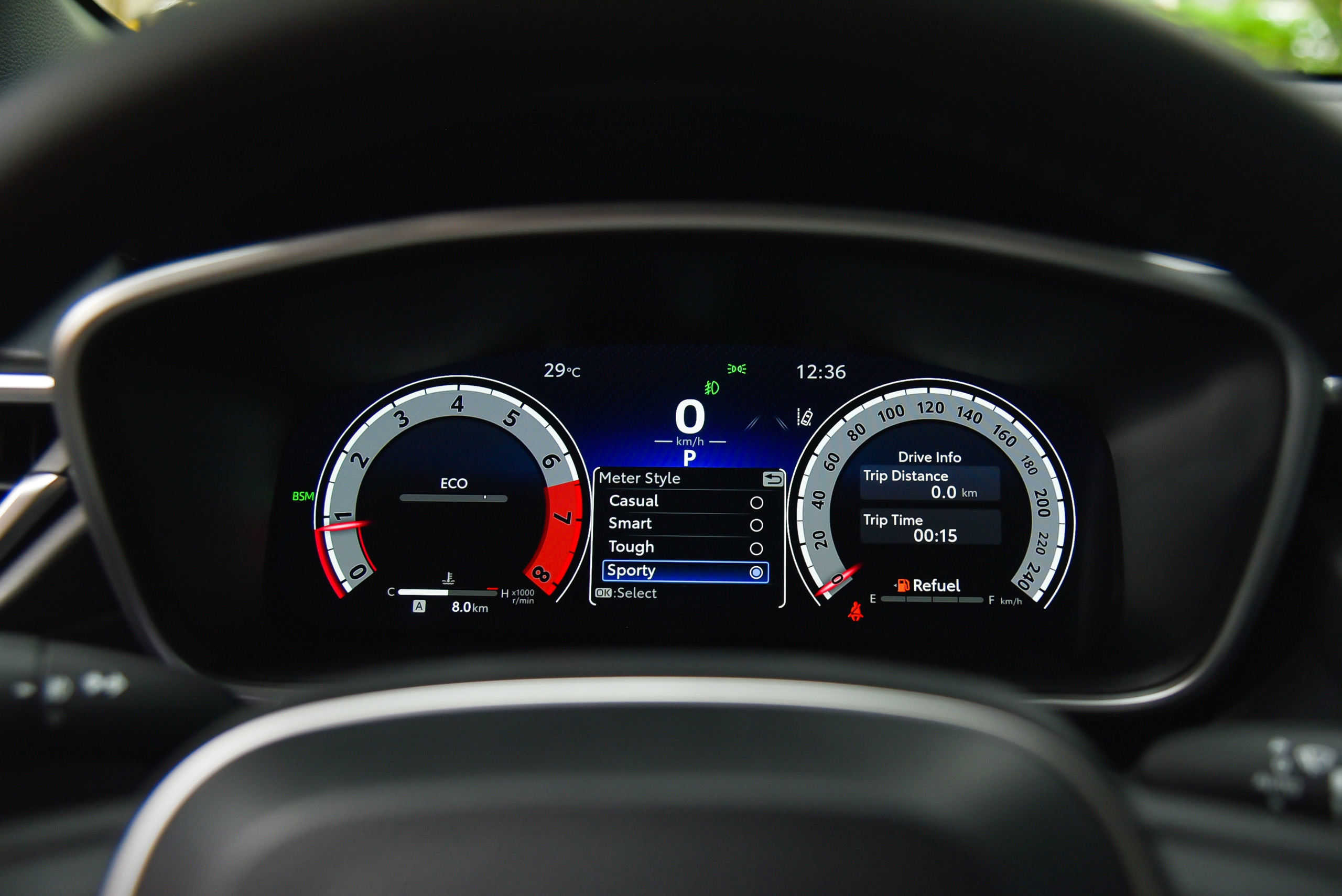 Điểm mới đầu tiên của cabin xe là đồng hồ tốc độ cơ học ở bản xăng cũ nay đã chuyển thành điện tử toàn phần, với màn hình 12,3 inch có độ nét cao và hiệu ứng chuyển động mượt mà. Toyota mang tới cho người dùng 3 kiểu giao diện khác nhau để khách hàng lựa chọn.