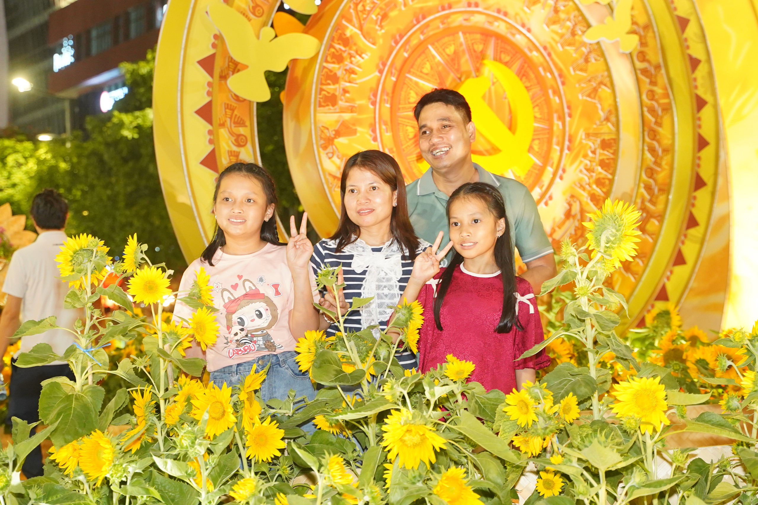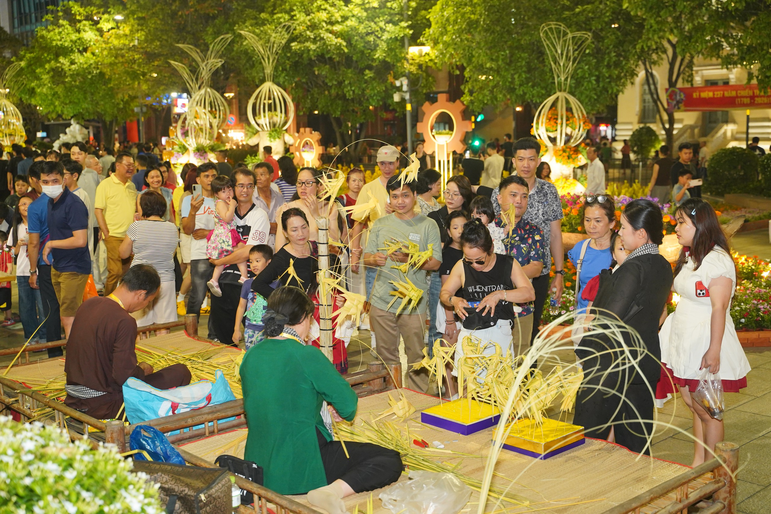Từ chiều tối, các tuyến đường dẫn về khu trung tâm đã nhộn nhịp người và xe. Nhiều nhóm bạn trẻ diện áo dài, check-in tại các địa điểm trang trí Tết, tạo nên khung cảnh vừa truyền thống vừa hiện đại.