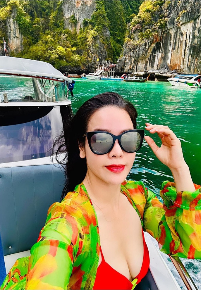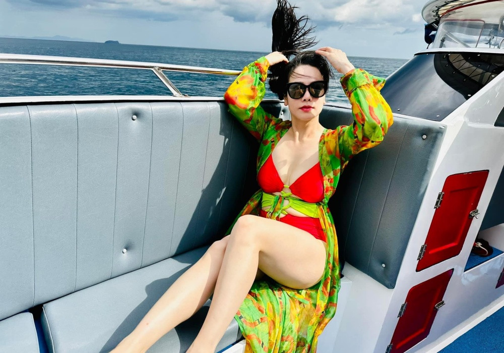 Nhật Kim Anh vừa có chuyến du lịch biển cùng gia đình sau thời gian bận rộn công việc. Cô đăng tải loạt ảnh nóng bỏng khi diện áo tắm kết hợp cùng áo choàng, tự tin khoe dáng trên du thuyền.
