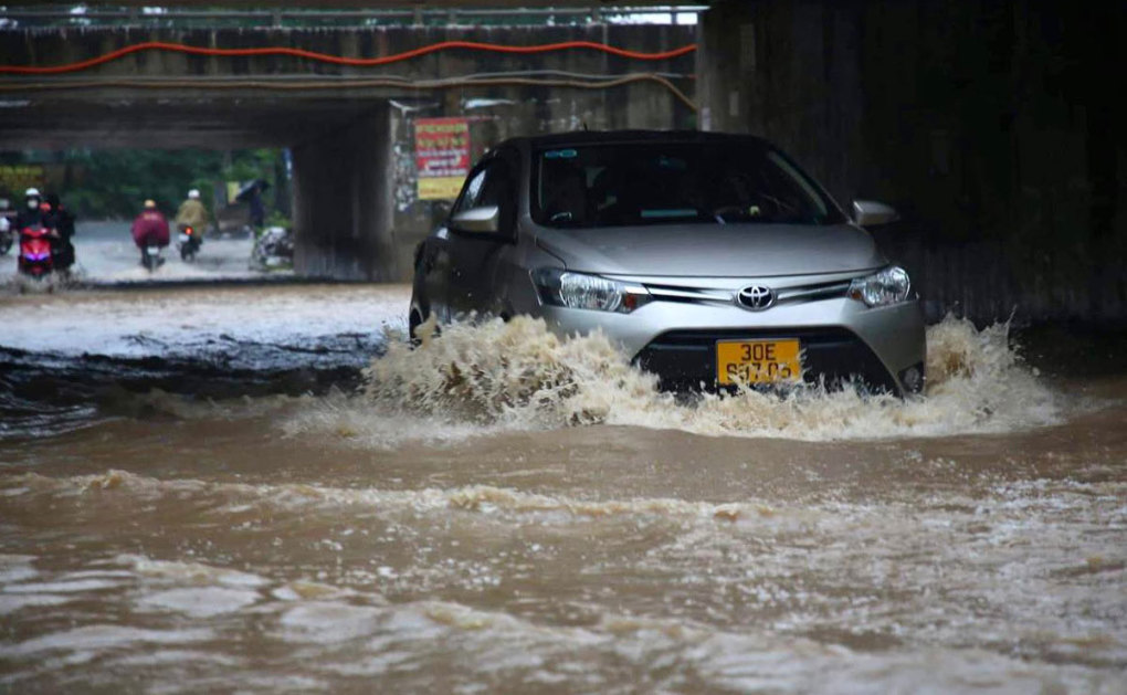 Đường Cổ Linh, Ngọc Lâm, quận Long Biên, bị ngập nặng. Đoạn qua gầm chui xe nửa phố Thiên Đức ngập hơn 30 cm, các phương tiện phải di chuyển chậm qua, nhiều xe chết máy phải nhờ tới cứu hộ.