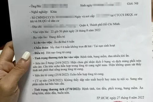 Khi nhóm này rời đi, chị D. phát hiện bị chảy máu vùng dưới nên nhờ người thân đưa vào bệnh viện cấp cứu. Tại đây, bác sĩ chẩn đoán chị D. đã bị sẩy thai.
