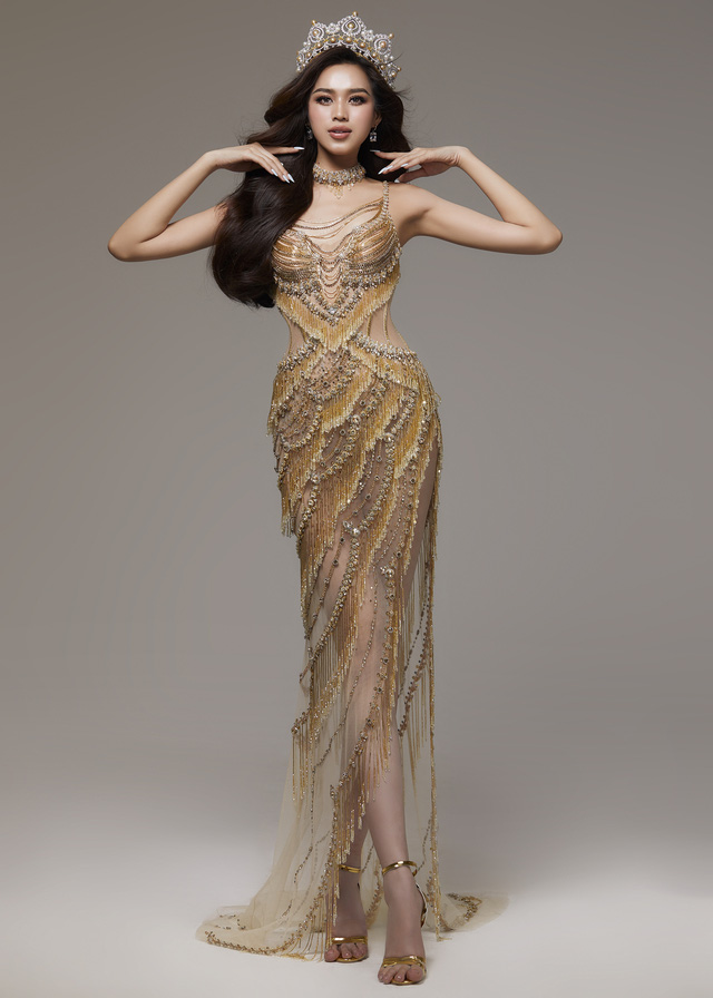 Với tone màu vàng đồng chủ đạo, bộ váy được lấy cảm hứng từ chính màu sắc và những đường nét tinh xảo trên chiếc vương miện của Đỗ Hà. Với kỹ thuật dựng corset bên trong và phần xẻ tà cao ngút giúp Đỗ Hà tôn lên vẻ đẹp hình thể cùng đôi chân dài thẳng tắp của nàng hậu.