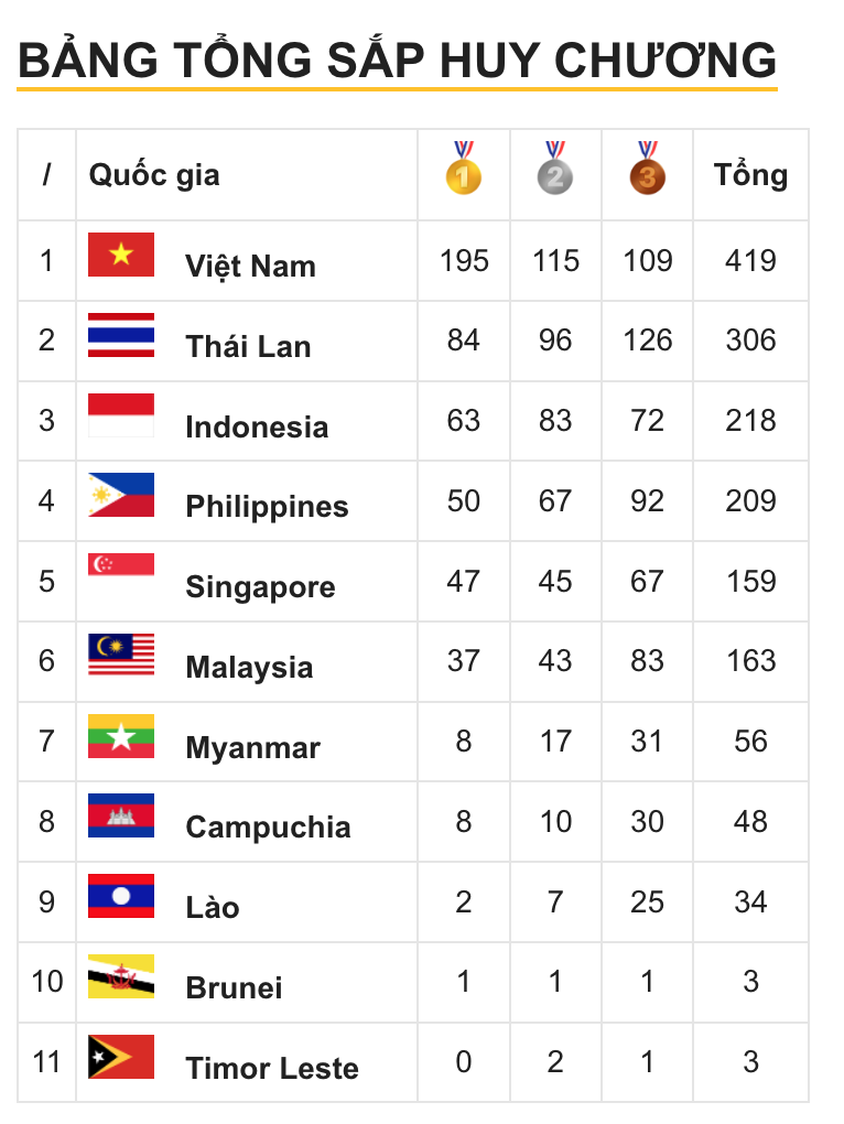 Tính đến 18h ngày 22/5, đoàn thể thao Việt Nam giành được 195 huy chương Vàng, qua đó chính thức xô đổ kỷ lục 194 huy chương Vàng mà đoàn thể thao Indonesia thiết lập tại SEA Games 1997.