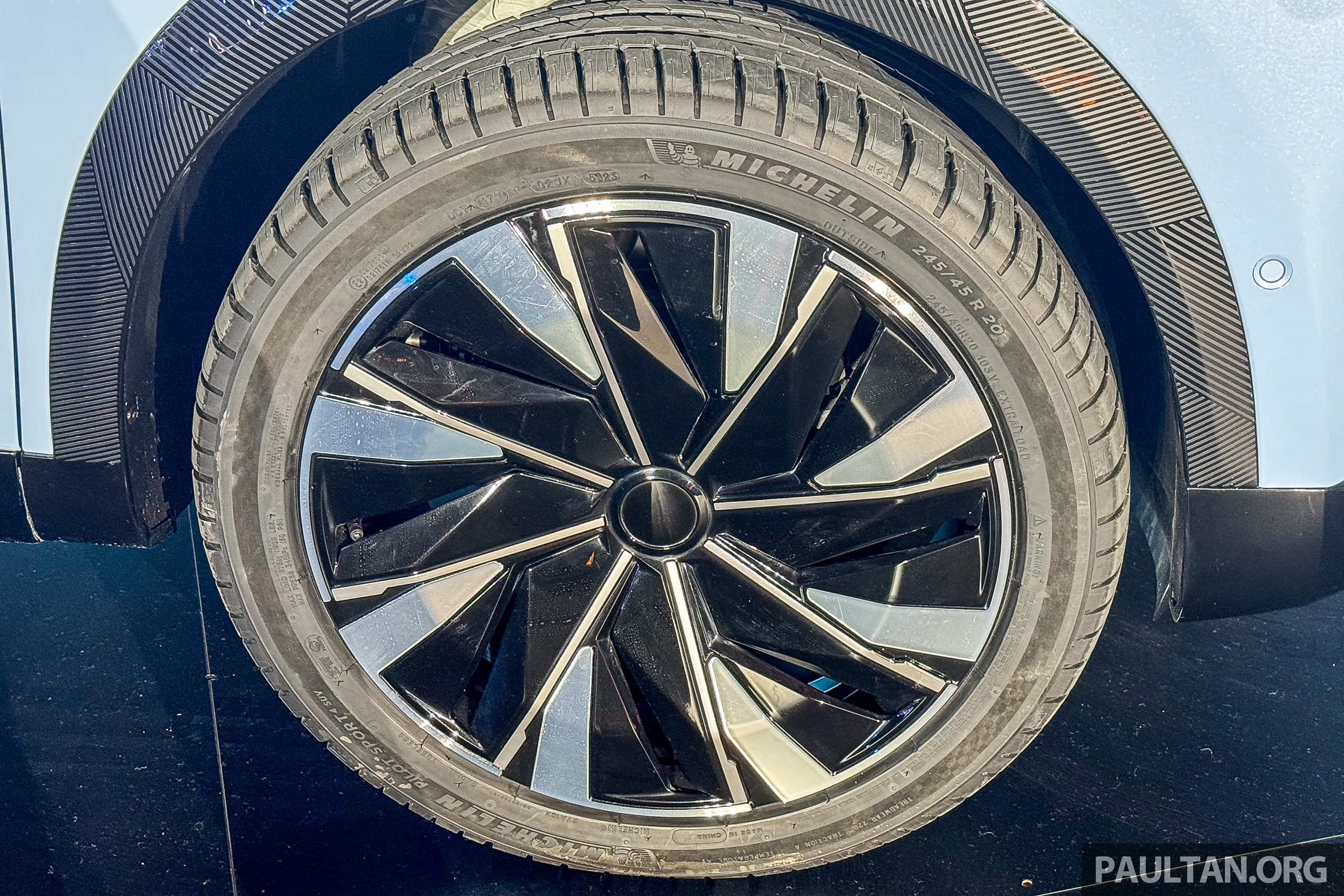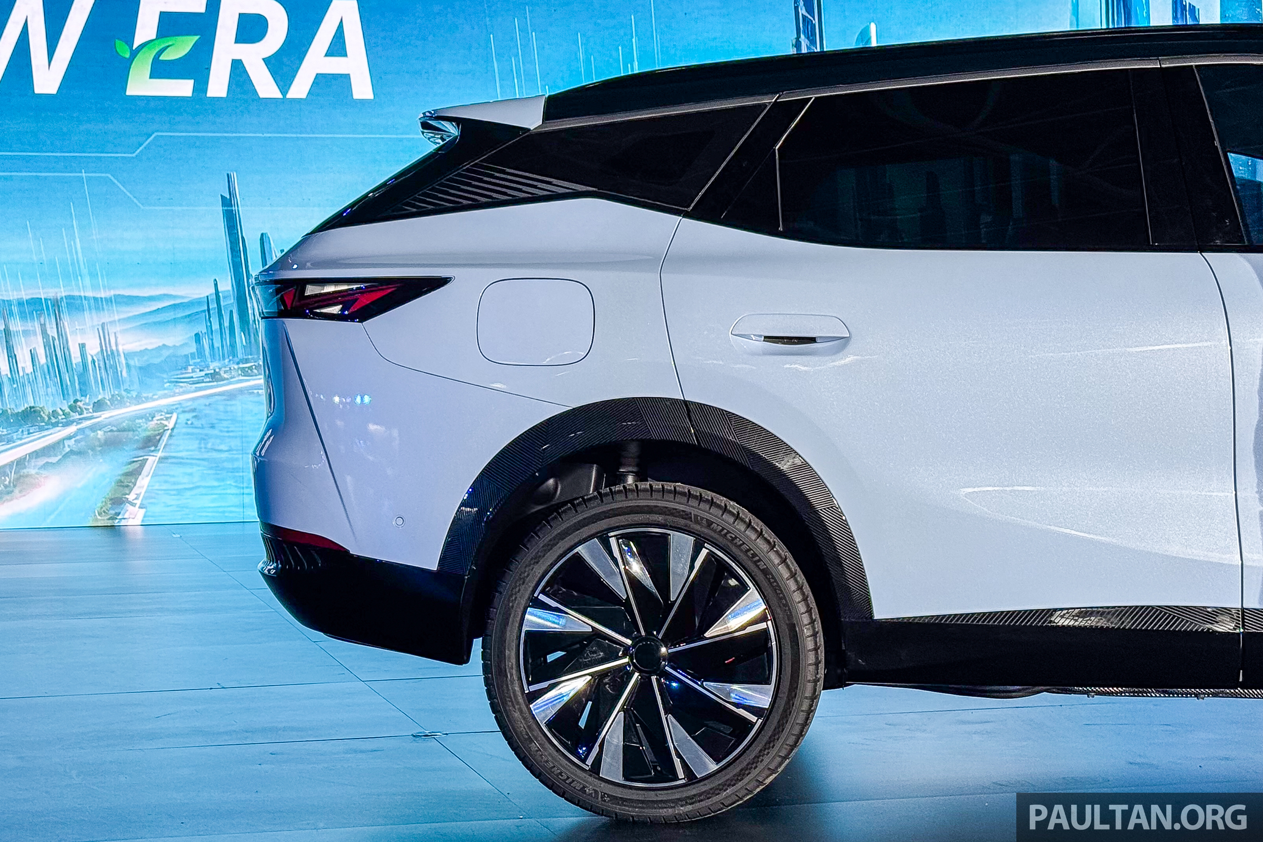 Tại hông xe, mâm hợp kim 2 tông màu 20 inch và tay nắm thường (khá ít gặp trên xe Trung Quốc mới khi nhiều hãng xe nước này chuộng tay nắm ẩn) và vòm bánh có họa tiết riêng là những điểm nhấn đáng chú ý.