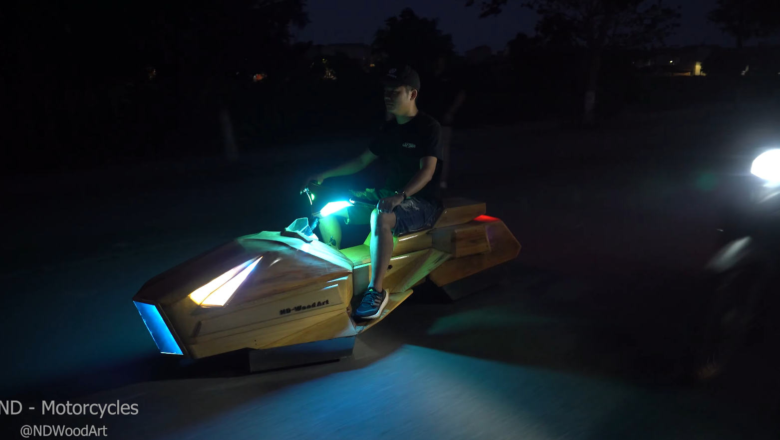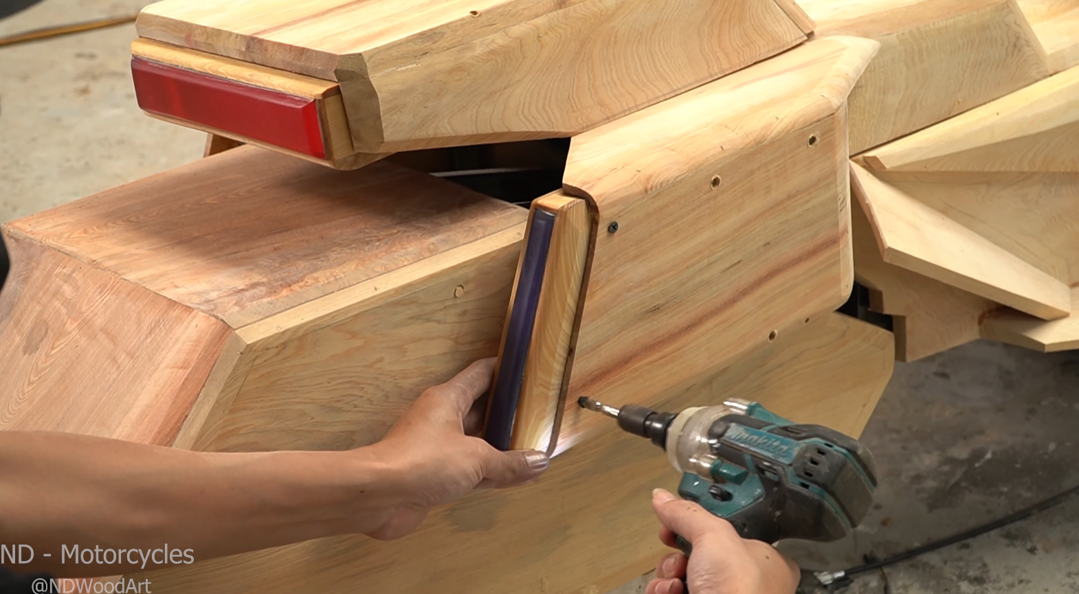 Sau khi hoàn thiện tạo hình, anh Đạo tiến hành bổ sung thêm hệ thống chiếu sáng cho xe. Qua đó, chiếc mô-tô bay bằng gỗ của anh đạo có đầy đủ đèn định vị phía trước, sau và phần tay lái.