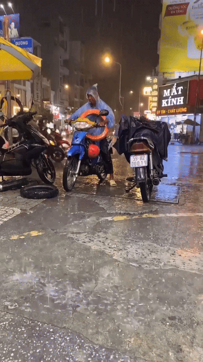 Chú sửa xe đội mưa chạy đi mua lốp về thay