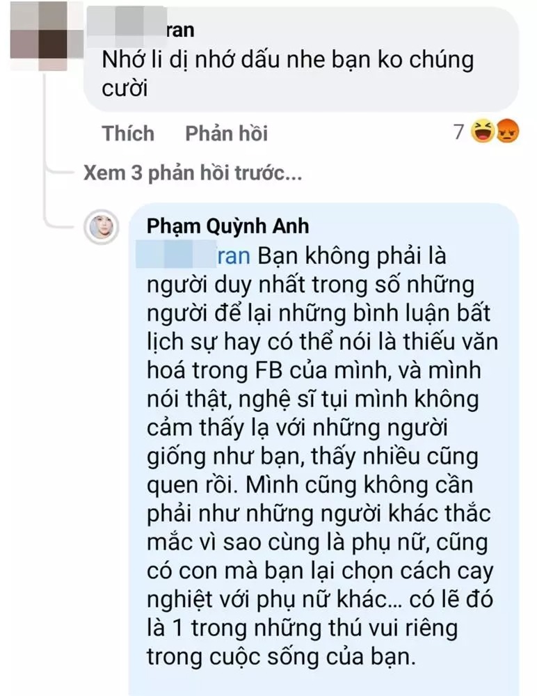 Trước lời lẽ khá cay nghiệt, Phạm Quỳnh Anh lập tức lên tiếng đáp trả: "Bạn không phải là người duy nhất để lại những bình luận bất lịch sự hay có thể nói là thiếu văn hóa trong Facebook mình. Và mình nói thật, nghệ sĩ tụi mình không cảm thấy lạ với những người giống như bạn, thấy nhiều cũng quen rồi.