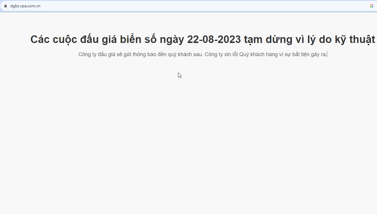 Đến 10h22, trang web đấu giá vẫn không truy cập được và hiện lên dòng chữ “Các cuộc đấu giá biển số ngày 22/8/2023 tạm dừng vì lý do kỹ thuật”.