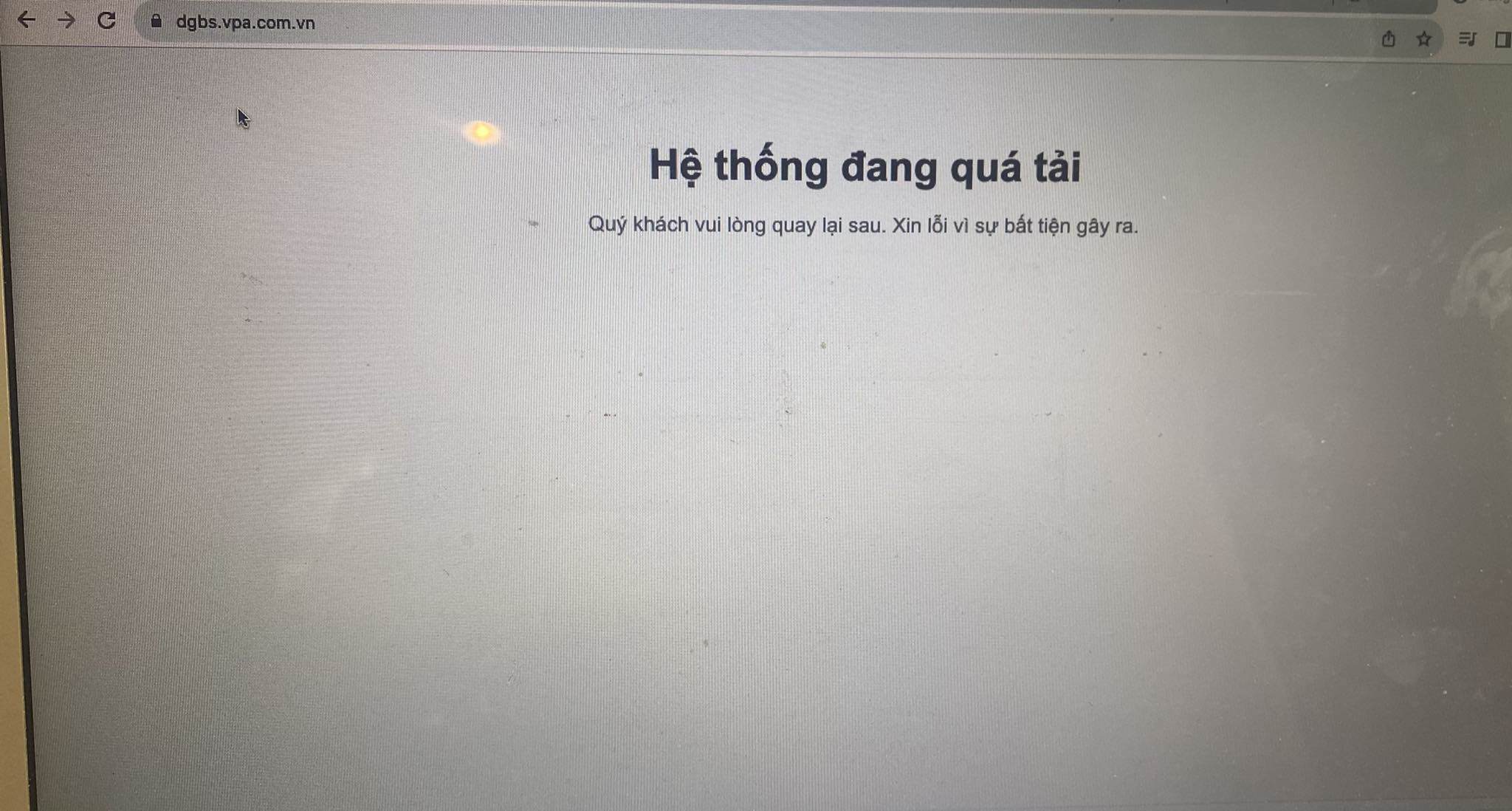 Đến 10h cùng ngày, PV vào đường link trang web đấu giá biển số https://dgbs.vpa.com.vn/ nhưng không thể truy cập, màn hình hiện màu trắng cùng dòng chữ “Hệ thống đang quá tải quý khách vui lòng quay lại sau. Xin lỗi về sự bất tiện gây ra".