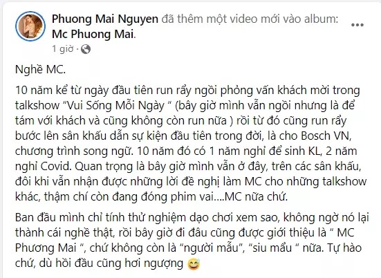 Cách đây ít giờ, MC Phương Mai gây chú ý khi đăng đàn trải lòng trên trang cá nhân về hành trình đến với nghề MC của mình. Cô chiêm nghiệm: "Ban đầu mình chỉ tính thử nghiệm dạo chơi xem sao, không ngờ nó lại thành cái nghề thật, rồi bây giờ đi đâu cũng được giới thiệu là 'MC Phương Mai', chứ không còn là 'người mẫu', 'siêu mẫu' nữa. Tự hào chứ, dù hồi đầu cũng hơi ngượng...
