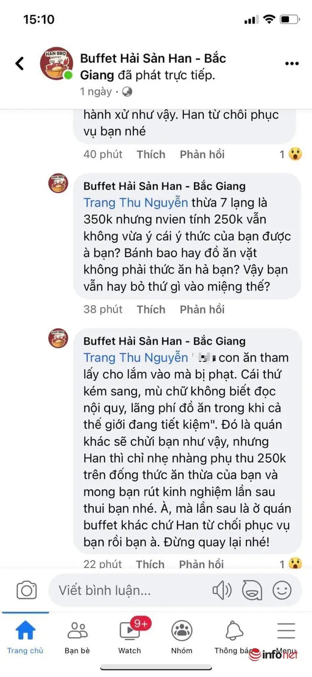 "... con ăn tham lấy cho lắm vào mà bị phạt. Cái thứ kém sang, mù chữ không biết đọc nội quy, lãng phí đồ ăn trong khi cả thế giới đang tiết kiệm". Đó là quán khác sẽ chửi bạn như vậy, nhưng Han chỉ nhẹ nhàng phụ thu 250k trên đống thức ăn thừa của bạn và mong bạn rút kinh nghiệm lần sau thôi bạn nhé. À, mà lần sau là ở quán buffet khác nhé chứ Han từ chối phục vụ bạn rồi bạn à. Đừng quay lại nhé", nội dung đáp trả của quán buffet đối với khách lấy nhiều đồ ăn thừa khiến dân mạng chú ý.