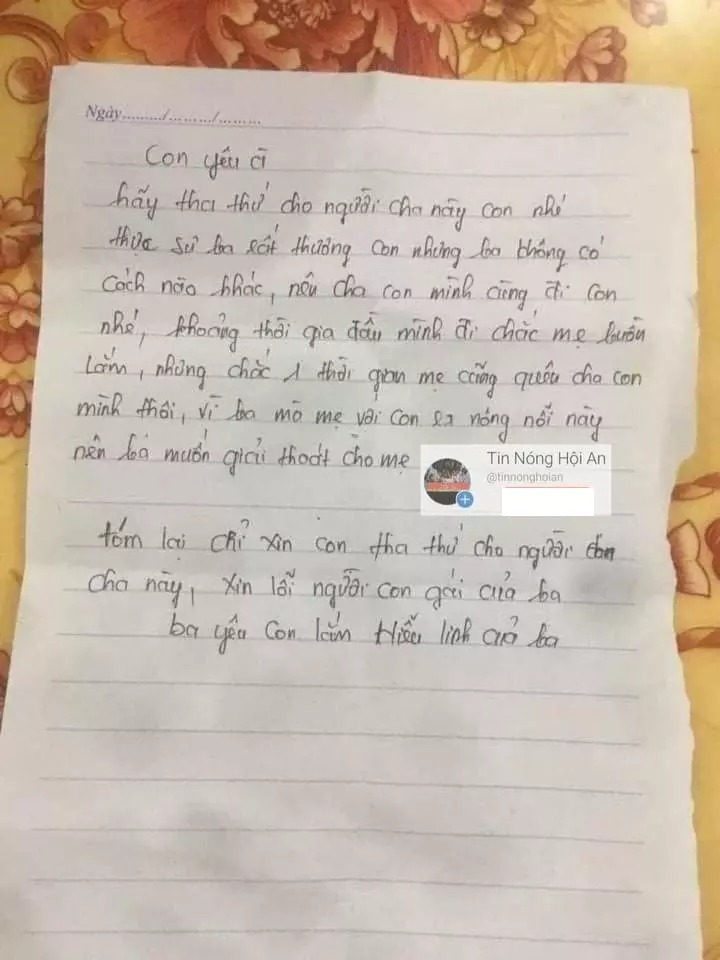 Hãy tha thứ cho người cha này con nhé. Thực sự ba rất thương con nhưng ba không có cách nào khác, nên cha con mình cùng đi con nhé. Khoảng thời gian đầu mình đi chắc mẹ buồn lắm, nhưng chắc một thời gian mẹ cũng quên cha con mình thôi. Vì ba mà mẹ với con ra nông nỗi này nên ba muốn giải thoát cho mẹ.