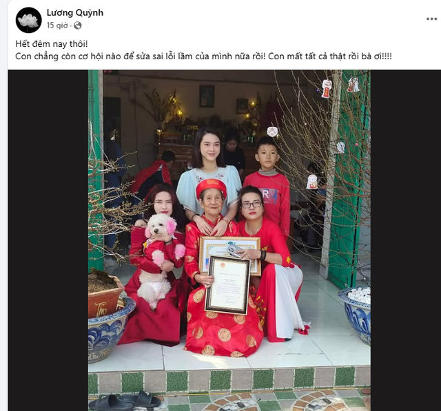 Quỳnh Lương viết: "Công việc của bà em đã xong. Em xin cảm ơn tất cả tình yêu thương, chia buồn của mọi người tới gia đình em những ngày qua ạ. Quá nhiều yêu thương không thể nào đáp lại được".